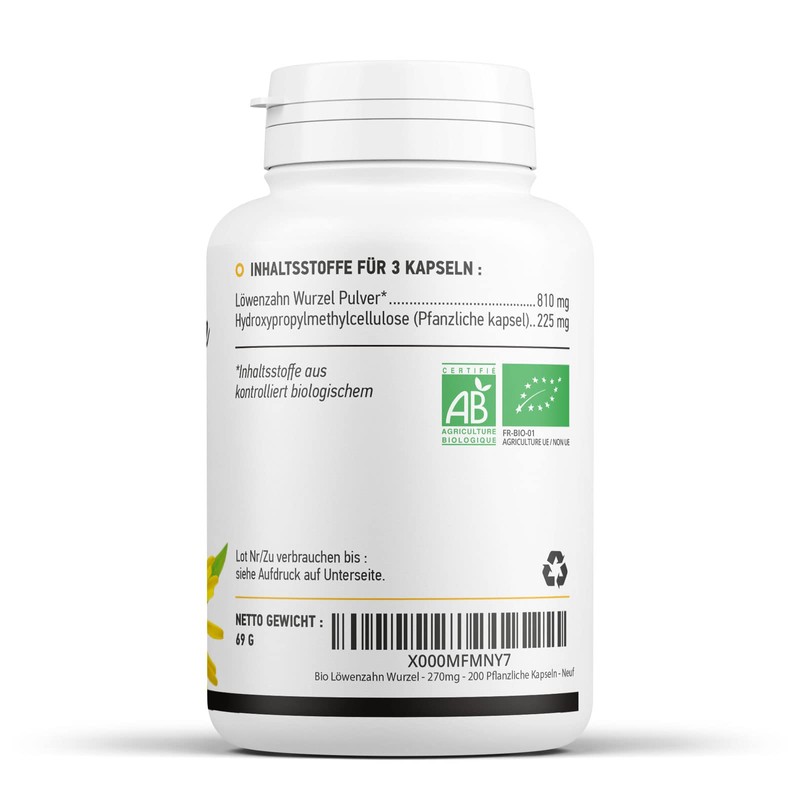 - Bio Löwenzahn Wurzel - 270mg - 200 Pflanzliche Kapseln
