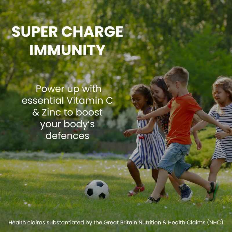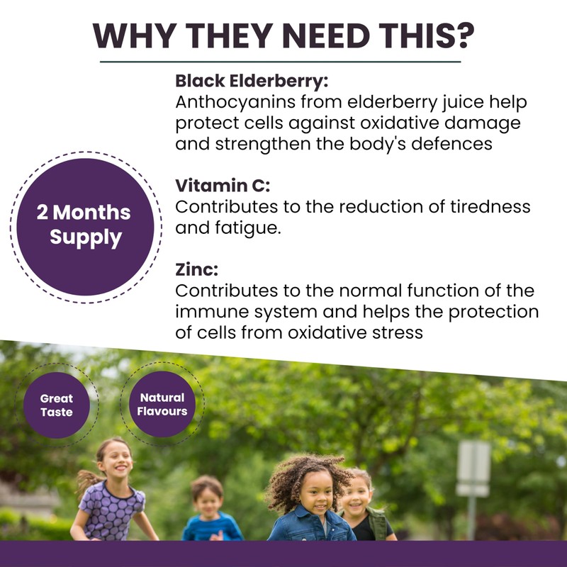 - Powerful Immunity Support: Packed with essential nutrients like Vitamin C, Zinc, and Elderberry to give your child's immune system the boost it needs. Vitamin C is a key antioxidant that helps fight off harmful free radicals, protecting cells and enhancing the body's natural defences. Zinc supports the development and function of immune cells, ensuring your child has a robust immune response. Elderberry, rich in beneficial anthocyanins, provides additional antiviral and anti-inflammatory support, helping to protect your child from common infections.