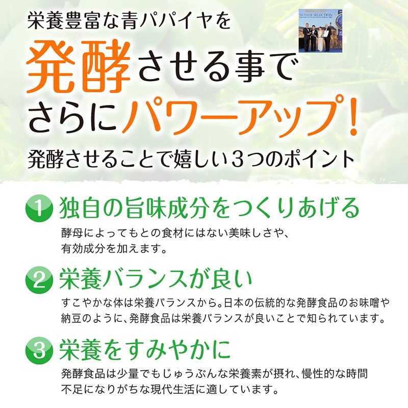 Blue papaya is a rare food containing papaine enzymes that break down all 3 major nutrients (protein decomposing enzymes, liposomize enzymes, and sugar content (starch) decompose enzymes).By supporting the power of digestive enzymes of blue papaya, it supports the power of intake nutrients efficiently, and it supports digestion during diets and after dieting.