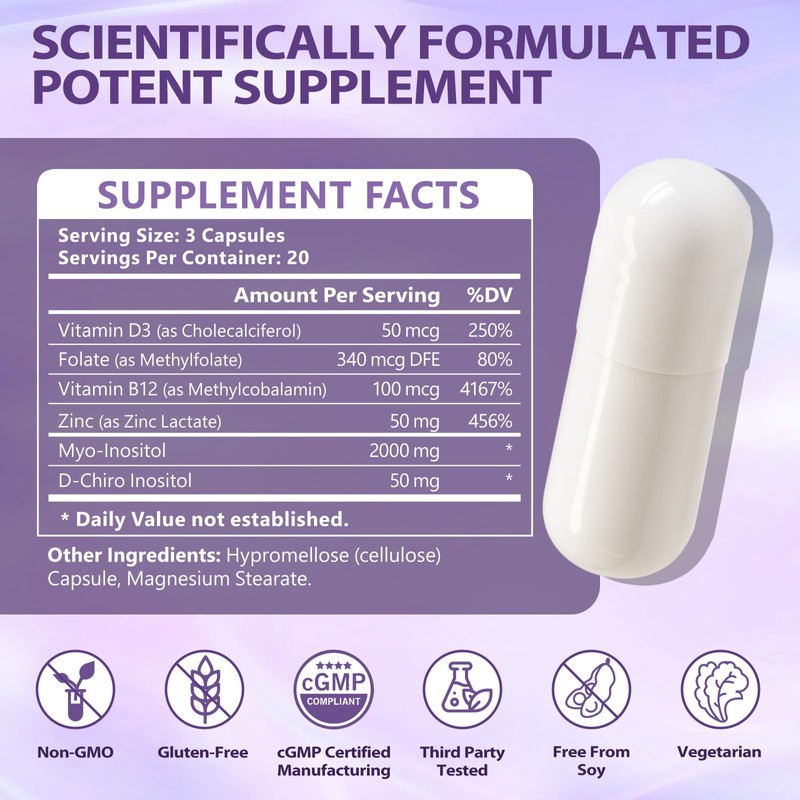 - Safe & Standard: Produced in a GMP-certified factory, all supplement capsules are non-GMO, gluten-free, vegan, dye-free, and do not contain any allergens. The myo-inositol and D-chiro inositol supplements have undergone rigorous testing to provide you with the best care for your health.