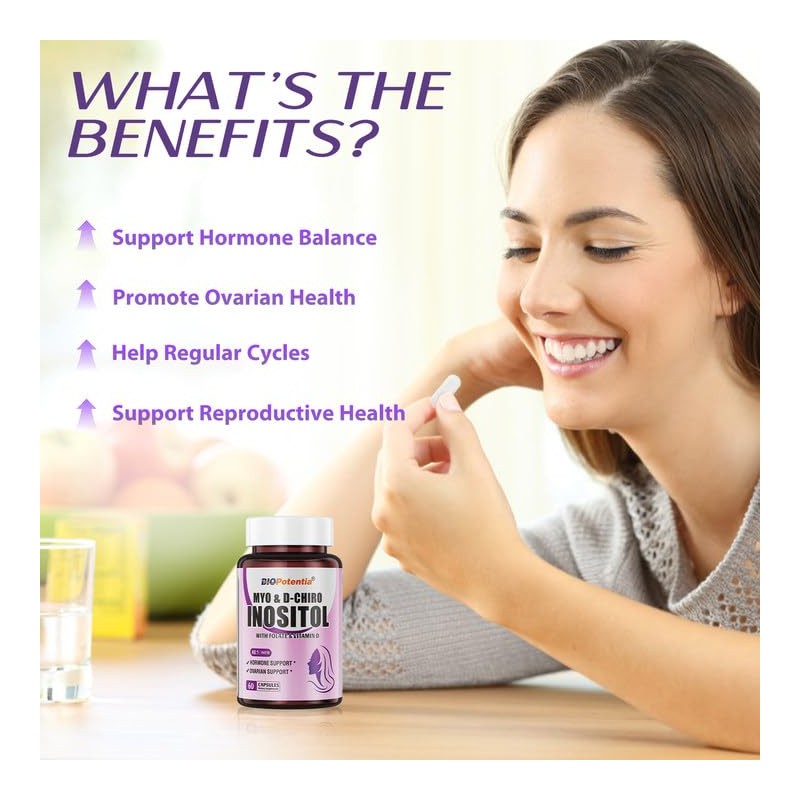 - Hormone Balance Support: This Inositol supplement for women contains the two most potent forms of inositol: myo-inositol and D-chiro-inositol, as well as rich sources of vitamin D3, folate, vitamin B2, and zinc. The inositol supplements help support hormone balance, promote ovarian health, and provide other essential functions within the body.