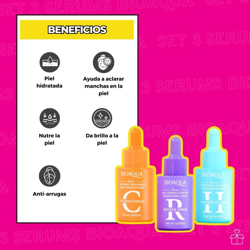 Set de 3 serums marca Bioaqua. El set incluye un serum de vitamina C, un serum de retinol y un serum de ácido hialurónico.