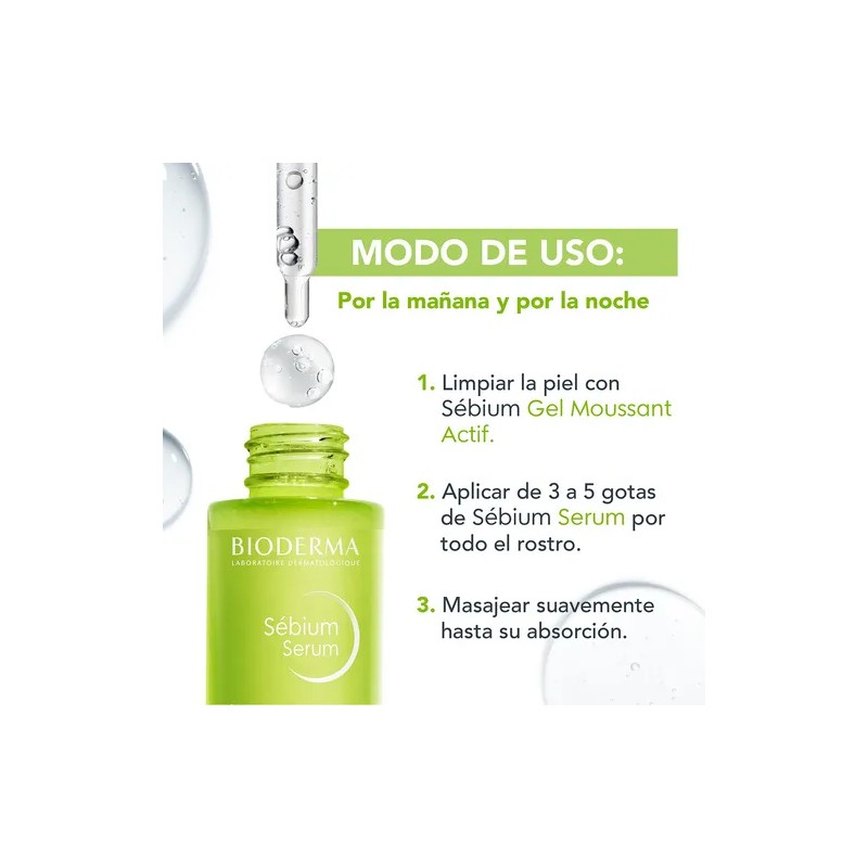 Aplica sobre la piel previamente limpia y distribuye de 3 a 5 gotas de Sébium Sérum por todo el rostro hasta su completa absorción. Consulta regularmente a tu dermatólogo.