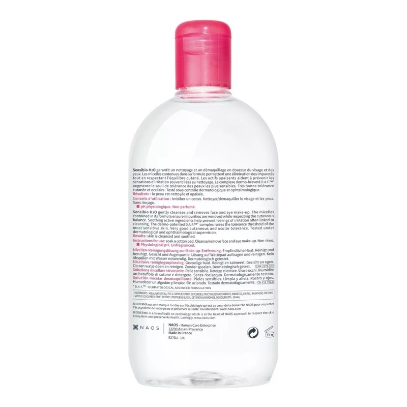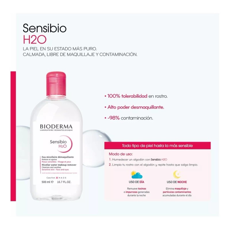 Sensibio H2O es un agua micelar específica que limpia y desmaquilla las pieles sensibles. Sensibio H2O está hecho con micelas con excelentes propiedades limpiadoras y desmaquillantes, limpia en profundidad el rostro por la mañana y la noche, de modo que impide la penetración en la piel de contaminantes que aumentan la sensibilidad de esta La tecnología micelar desarrollada por Laboratoire Bioderma se inspira en los lípidos celulares de la piel. Actúa en perfecta armonía con la piel y conserva la película protectora natural. Sensibio H2O está formulado con un pH fisiológico de alrededor de 5,5, por lo que respeta el equilibrio biológico de la piel, algo esencial para mantener la piel sana Calma y previene los riesgos proinflamatorios. Sensibio H2O contiene agua altamente purificada y de tipo farmacéutico. También cuenta con un complejo de 3 azúcares biomiméticos calmantes que previenen el proceso inflamatorio. Los ingredientes se seleccionan cuidadosamente para asegurar una tolerancia perfecta y garantizar que ningún resto de producto dañe la piel.