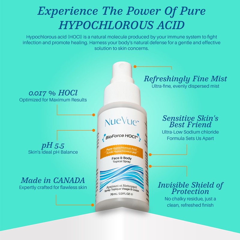 BioForce HOCl - Pure Hypochlorous Acid Spray for Face Travel Size Toner & Cleanser - Made in Canada - Acne-Prone Skin & Eczema, Piercing aftercare, pH Balanced, Non-comedogenic - NueVue (2.3 oz)