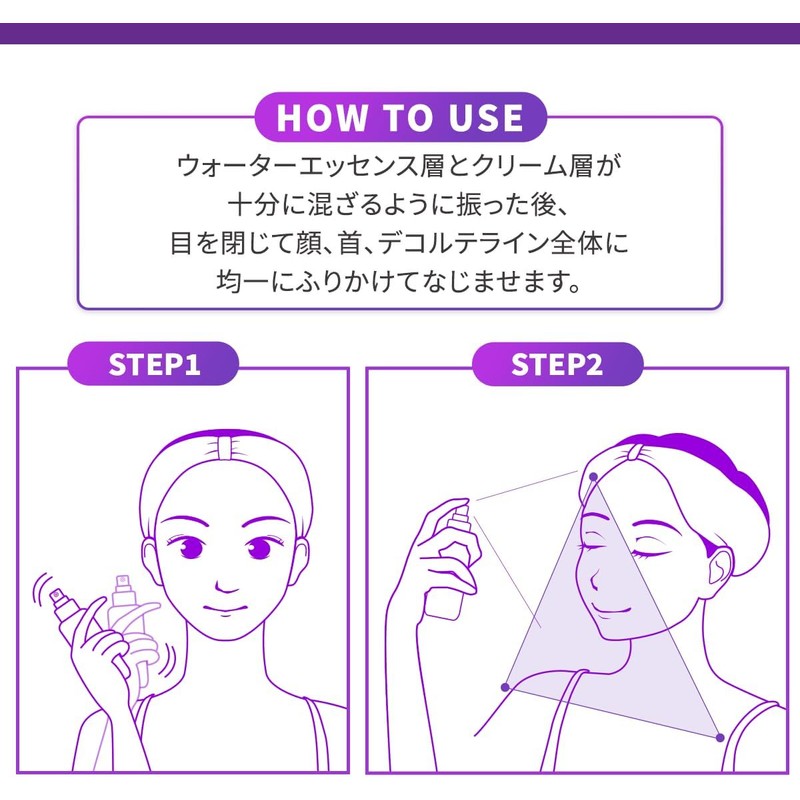 Shake well before use. Hold bottle 20cm from face, close your eyes, and spray evenly. Gently pat in for absorption. Can be used over or under makeup.