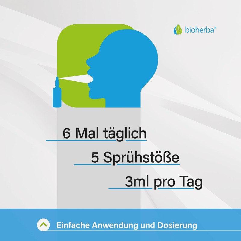 Für optimale Ergebnisse 6-mal täglich 5 Sprühstöße (entspricht ca. 3 ml pro Tag) anwenden. Diese einfache Anwendung sorgt für eine effektive Dosierung und Unterstützung.
