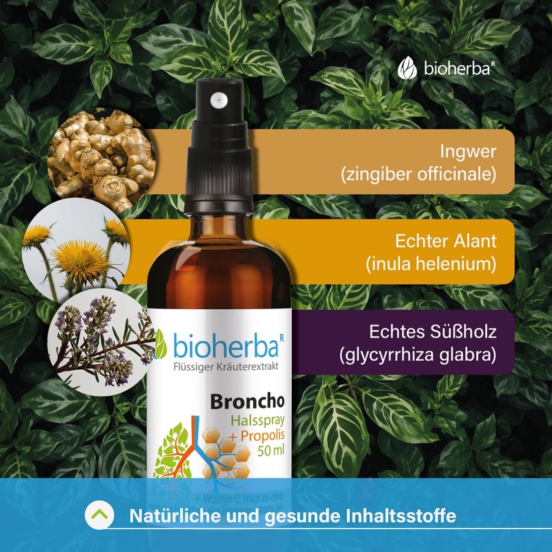 BIOHERBA Halsspray Broncho mit Propolis Extrakt 50 ml – Natürliches Rachenspray - Hustenmittel mit Ingwer + Vitamin C und Pflanzenextrakten, Unterstützt Immunsystem, PZN: 17188640