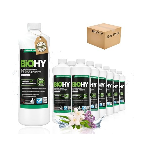 BiOHY Bodenreiniger für alle Wischroboter mit Frühlingsduft (12 x 1 Liter) | Schaumarm & Streifenfrei | Reinigungsmittel Konzentrat für alle Böden
