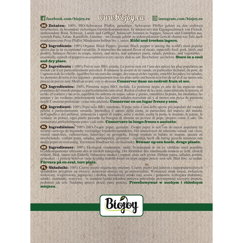 - ➤ BIO-SCHWARZER-PFEFFER (GEMAHLEN) | Aromatische Pfefferbeeren in BIO-Qualität – getrocknet, würzfertig fein gemahlen und ohne Zusätze in unsere schützenden Biojoy-Aromabeutel abgefüllt.