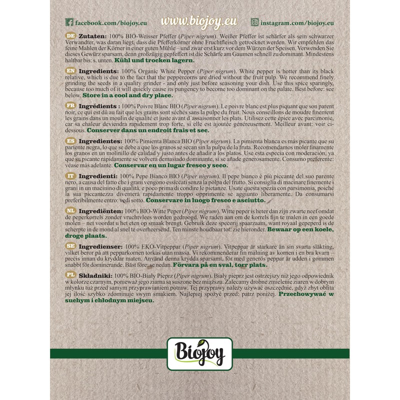 - Satisfaction | We are very happy to learn how satisfied you are with the white organic pepper from Biojoy Does it meet your taste? Please let us know through a review!