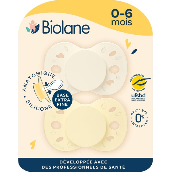 BIOLANE - Anatomically shaped teat - extra thin dummy - 0-6 months - yellow and beige - flat and reversible nipple - optimal comfort - respect for mouth development