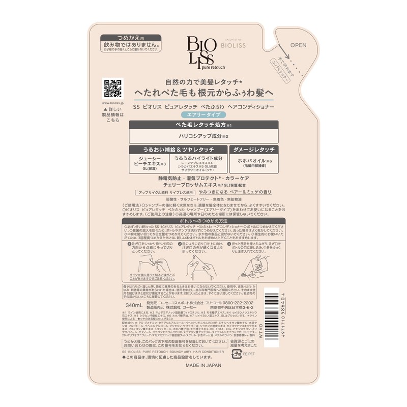 Biolis Pure Retouch Petafuwa Hair Conditioner, Refill, 11.6 fl oz (340 ml), Airy Type, Fluffy