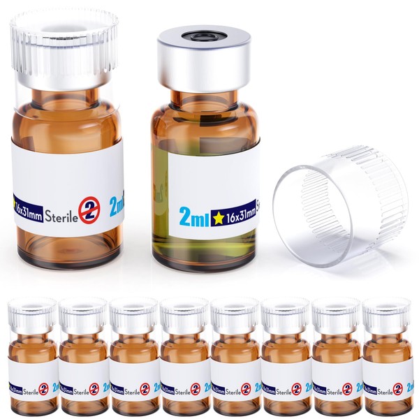 Biomed Solutions Sterile Empty Vial with Reusable Plastic Cap,Ready to Fill Glass Containers, Liquid Injection Bottle Sealed with Self Healing Injection Port (2ml Amber 10pcs)