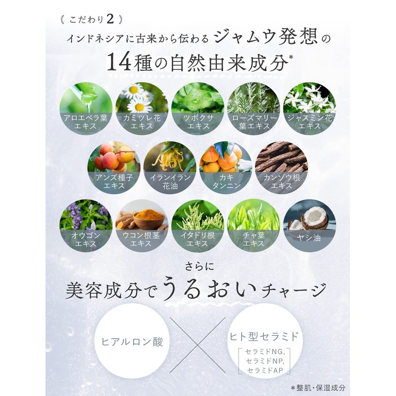 - (14 natural ingredients inspired by Jam muu) Formulated with 14 natural ingredients that are enjoyed by women from ancient Jamu inspired by Jam from Indonesia. It also contains hyaluronic acid and humanized ceramide to charge moisture