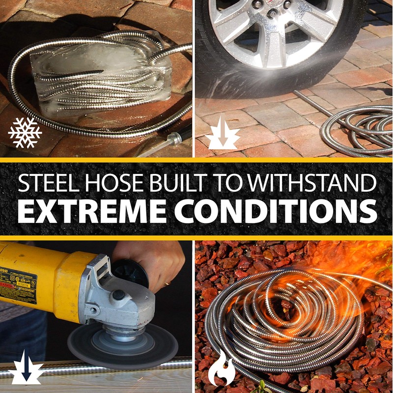 - Kink Free: The body of the hose is encased in a sturdy stainless-steel outer layer allows for a consistent, steady and high-pressure water output yet is memoryless, meaning it will lay flat, resist kinks, can coil easily and store effortlessly