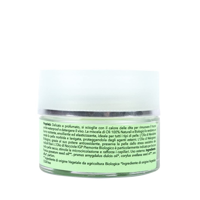 • Organic ingredients of Italian quality. The moisturising make-up butter is formulated with a blend of 100% natural nourishing oils (organic pomegranate oil, sweet almond oil, nut oil IGP of the foot), suitable for all skin types