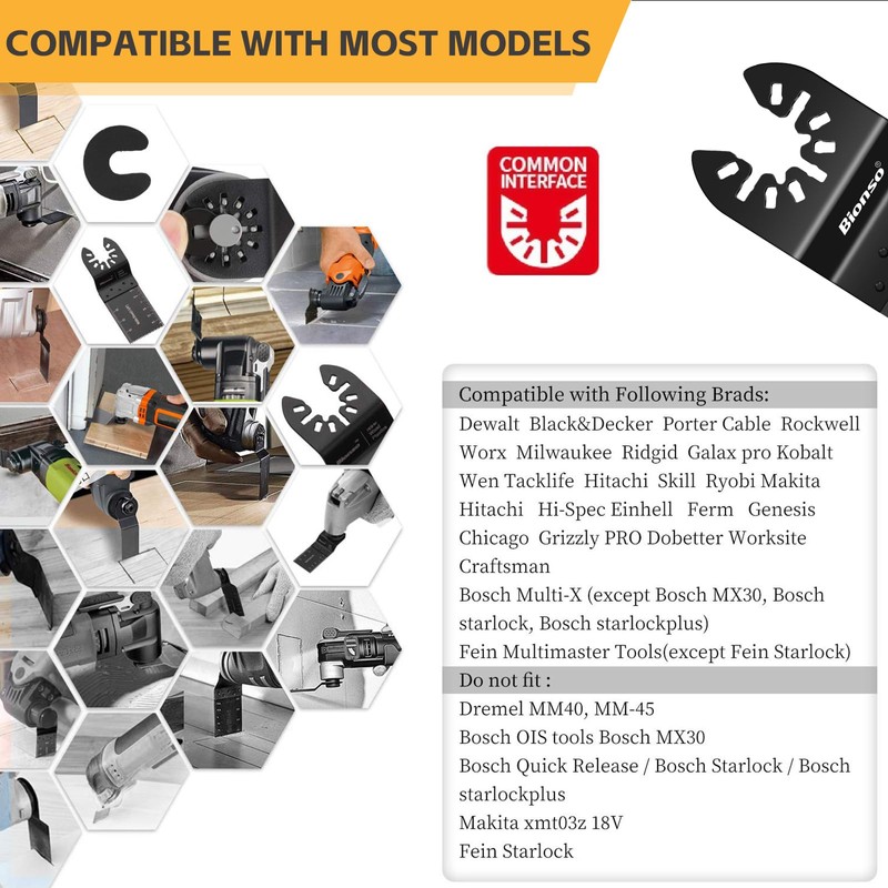 - Compatibility: With a universal interface system, it is perfectly compatible with more than 95% of the oscillating tools on the market. (Please refer to the pictures and information page for details about the adapter model number. We make it easy for you to choose which works best for you!)