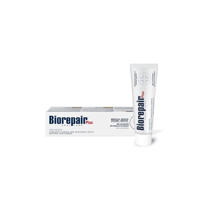 Every day our teeth are subjected to mechanical (toothbrush) and chemical wear (acidic food) which cause imperceptible micro-breaks where plaque, bacteria and pigments can accumulate. In the long term this can cause tooth decay, deterioration, loss of brightness and teh onset of sensitivity and gum problems. Biorepair Plus Pro White: