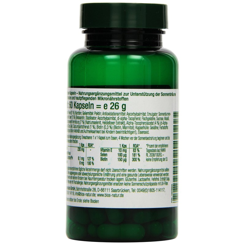 - Dietary supplement to support the suntan with carotenoids and skin nourishing micronutrients.