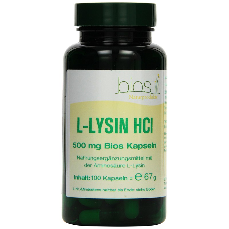 - L-Lysine HCl 500 mg Bios capsules contain 500 mg L-lysine hydrochloride in a hard gelatine capsule