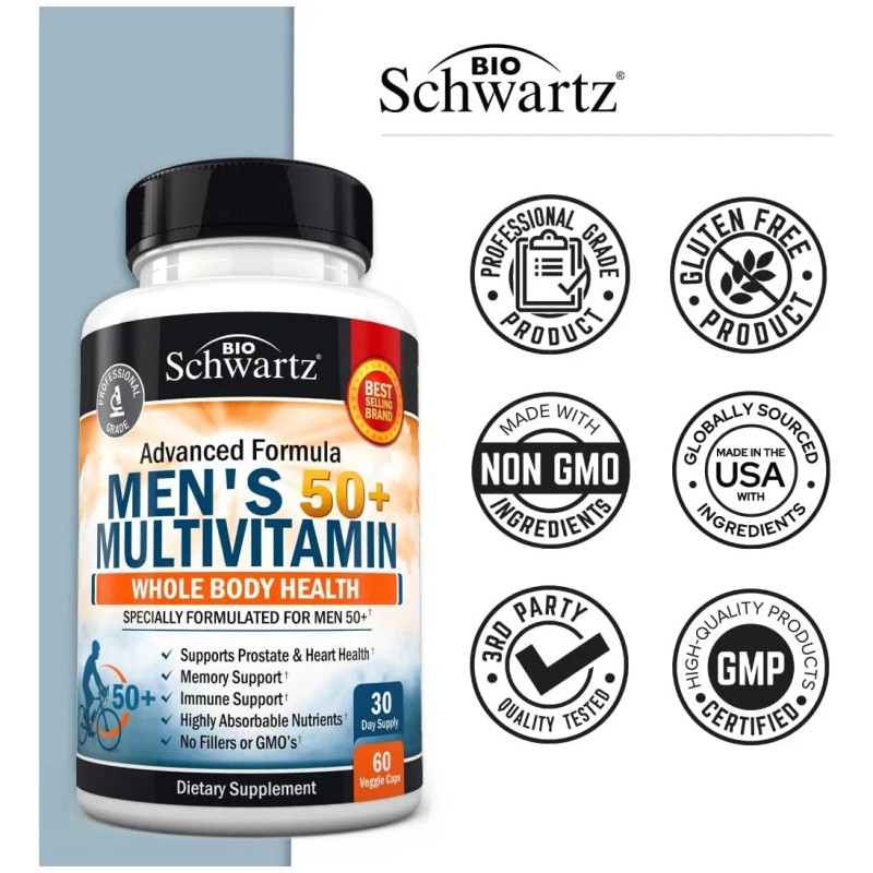 Tamaño: 60 unidades (paquete de 1) - Promueve claridad mental y concentración: la fórmula avanzada para hombres mayores de 50 años de BioSchwartz contiene una mezcla especial de superalimentos con hongos que apoyan la vitalidad y mantienen la salud cerebral a largo plazo, para que pases menos tiempo con sensación de confusión y más tiempo enfocado - Fórmula para defensa inmune: este multivitamínico avanzado para hombres 50+ contiene vitamina C, zinc y hongos reishi para promover protección celular, actividad antioxidante y soporte al sistema inmunológico - Incremento natural de energía: el multivitamínico avanzado para hombres 50+ de BioSchwartz incluye el complejo completo de vitaminas B para energía limpia y duradera que te mantenga activo todo el día - Probado en pureza y libre de alérgenos: cada lote de nuestro multivitamínico para hombres 50+ es probado por terceros para garantizar la máxima pureza, potencia y calidad premium.