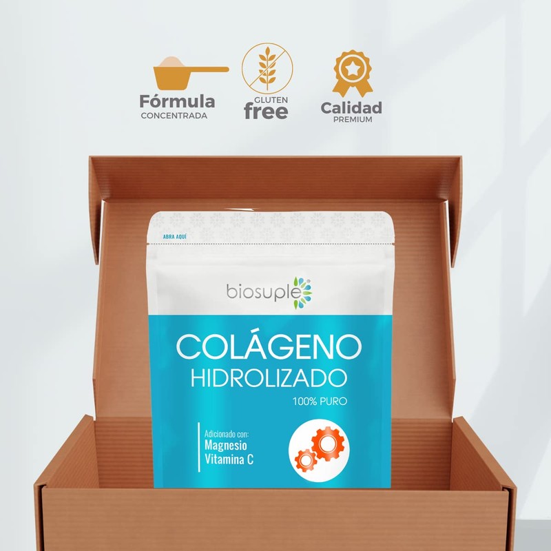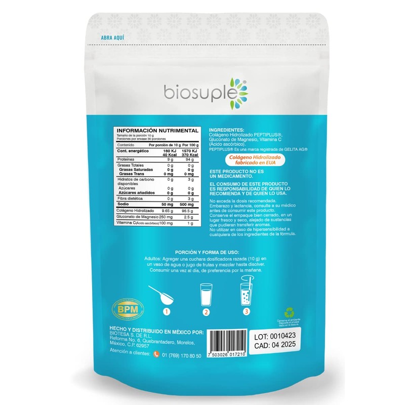 BIOSUPLÉ | Colágeno Hidrolizado Adicionado con Magnesio y Vitamina C, 300 g Sabor Natural
