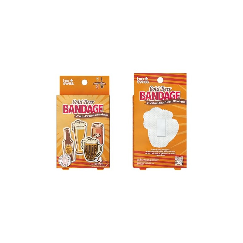 - COLD BEVERAGE BANDAGES: This 24 piece pack of Cold Beverage bandages feature 4 fun cold beverage shapes, and is sure to induce laughter and smiles while protecting wounds such as cuts, scrapes, and burns; sticky bandages come in a cute decorative cardboard box which makes for an excellent novelty gag gift or stocking stuffer for adults
