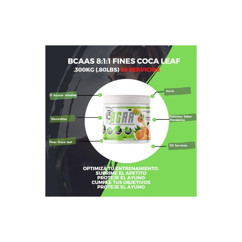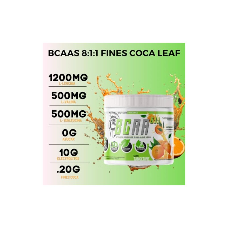 BIOTECKPHARMA | BCAAS 8:1:1 sabor tangerine 300 gr| Recovery| Energy| Aminos| Aminoacidos Bcaas| Post work| Pre work| Coca Leaf|