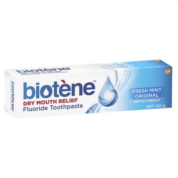 Brushing with Biotene toothpaste helps maintain a healthy oral environment by providing fluoride tooth protection for dry mouth suffers or for people who need a mild toothpaste.