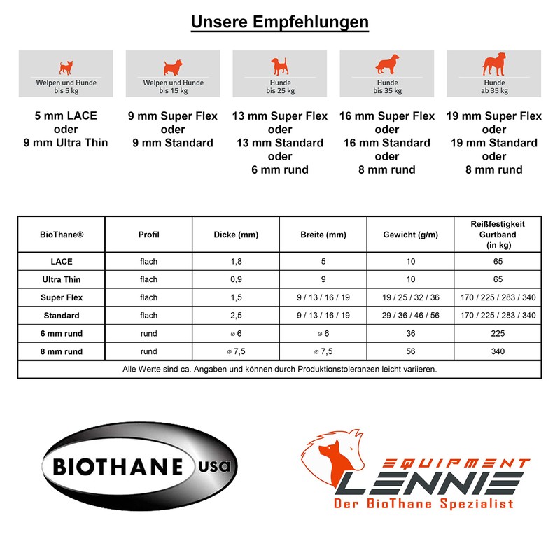 - Flat, robust BioThane lead - 9 mm wide standard BioThane (2.5 mm thick) - recommended for dogs between 5 and 15 kg (depending on training level).