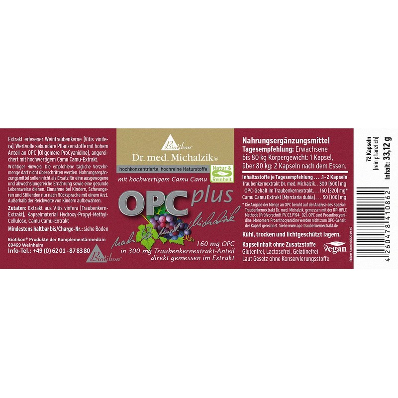 Biotikon OPC Plus according to Dr. med. Michalzik - 72 vegan capsules - 300 mg Vitis vinifera extract - 160 mg OPC 50 mg pure CamuCamu extract (vitamin C) per capsule - no additives - from BIOTIKON?