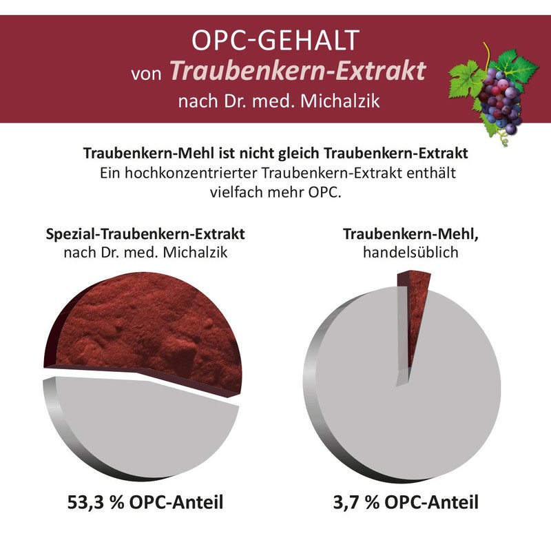 - OPC Plus 300 mg "OPC Premium-Traubenkernextrakt" pro Kapsel, mit mindestens 160 mg OPC. Reines OPC sind oligomere Procyanidine. Monomere Proanthocyanidine geh?ren nicht zu OPC.