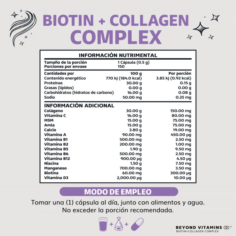 Características de Biotin + Collagen Complex Beyond Vitamins: Ingredientes NON-GMO Libre de azúcares, lácteos y soya Libre de edulcorantes, colorantes, saborizantes, ingredientes artificiales ni conservantes No contiene hormonas No contiene antibióticos MODO DE EMPLEO: Tomar una (1) cápsula al día, preferiblemente junto con alimentos (idealmente con grasas saludables, tales como aguacate, nueces, semillas o aceites de oliva o vegetales) y agua. No exceder la porción recomendada. PRECAUCIONES: No se recomienda su uso en menores de 18 años, Manténgase fuera del alcance de los niños. Conservar en un lugar fresco y seco. No consumir si el sello ha sido violado. Consumir antes de la fecha de expiración. El consumo de este producto es responsabilidad de quién lo recomienda y de quién lo usa. RESTRICCIONES DE USO: No se recomienda el uso de este producto durante el embarazo y lactancia.