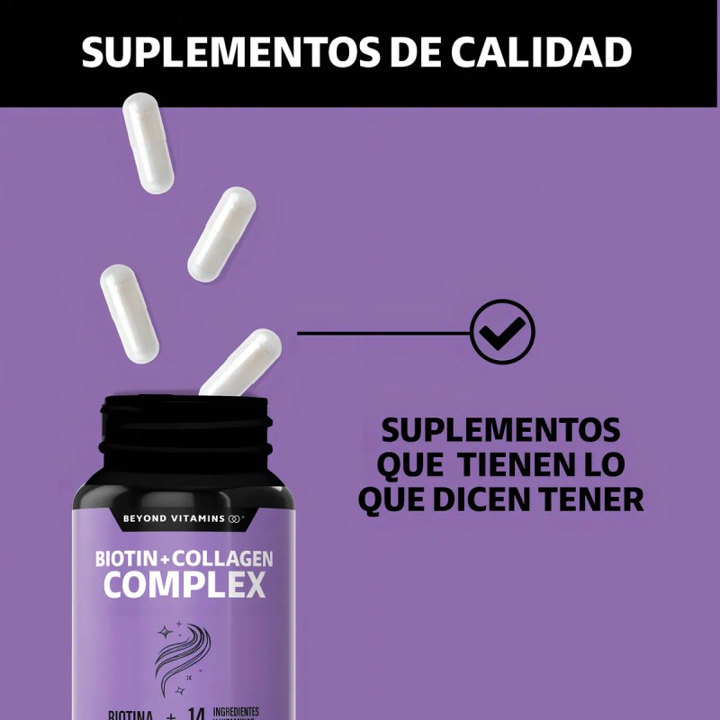 Características de Biotin + Collagen Complex Beyond Vitamins: Ingredientes NON-GMO Libre de azúcares, lácteos y soya Libre de edulcorantes, colorantes, saborizantes, ingredientes artificiales ni conservantes No contiene hormonas No contiene antibióticos MODO DE EMPLEO: Tomar una (1) cápsula al día, preferiblemente junto con alimentos (idealmente con grasas saludables, tales como aguacate, nueces, semillas o aceites de oliva o vegetales) y agua. No exceder la porción recomendada. PRECAUCIONES: No se recomienda su uso en menores de 18 años, Manténgase fuera del alcance de los niños. Conservar en un lugar fresco y seco. No consumir si el sello ha sido violado. Consumir antes de la fecha de expiración. El consumo de este producto es responsabilidad de quién lo recomienda y de quién lo usa. RESTRICCIONES DE USO: No se recomienda el uso de este producto durante el embarazo y lactancia.