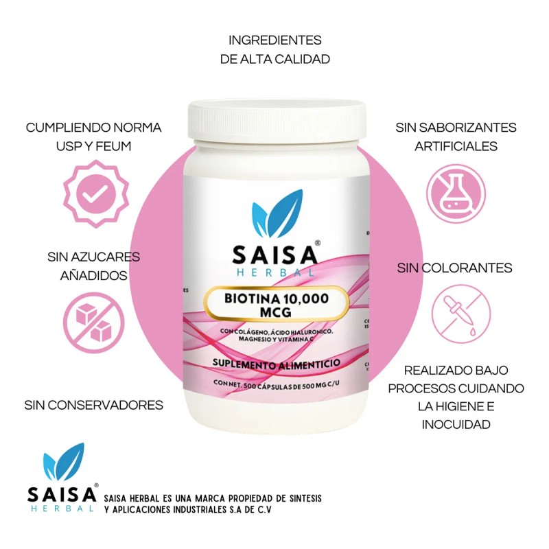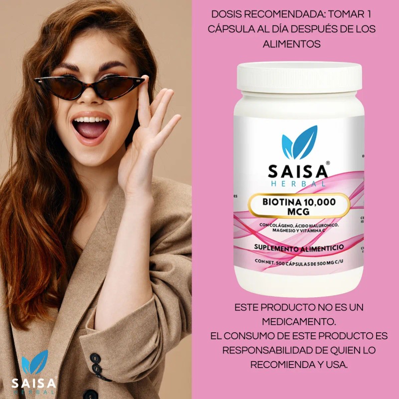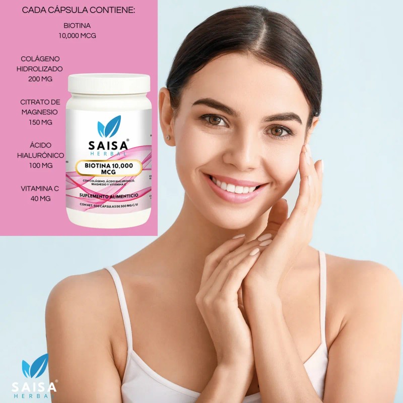 - Biotina 10,000 mcg + Colágeno + Ácido Hialurónico + Magnesio – Gran Presentación 500 Cápsulas El suplemento de Saisa Herbal combina biotina en alta concentración (10,000 mcg) con colágeno, ácido hialurónico y magnesio, una fórmula avanzada para fortalecer el cabello, piel y uñas, al tiempo que aporta apoyo a la salud ósea, muscular y energética. Su presentación de 500 cápsulas lo hace ideal para un consumo prolongado y económico. Beneficios principales Cabello fuerte y saludable con brillo natural gracias a la acción de la biotina. Uñas más resistentes y piel con mayor firmeza, por la sinergia del colágeno y el ácido hialurónico. Elasticidad y luminosidad de la piel, ayudando a reducir signos de envejecimiento. Apoyo a huesos y músculos, gracias al aporte del magnesio y su rol en el bienestar físico. Fórmula premium, libre de gluten, conservadores y colorantes artificiales. Palabras clave estratégicas Biotina 10000 mcg, suplemento belleza mujer, biotina colágeno ácido hialurónico, cabello piel uñas suplemento, biotina alta potencia 500 cápsulas, suplemento premium cabello. Calidad respaldada En Saisa Herbal elaboramos nuestros suplementos con procesos de calidad certificados bajo ISO 9001:2015 e ISO 22000:2018, lo que garantiza pureza, seguridad y eficacia en cada cápsula. Cada frasco contiene 500 cápsulas de alta biodisponibilidad, diseñadas para un consumo diario y resultados visibles. Fortalece tu cabello, protege tu piel y cuida tus uñas con Biotina 10,000 mcg + Colágeno + Ácido Hialurónico + Magnesio en presentación de 500 cápsulas de Saisa Herbal. Este producto no es un medicamento. El consumo de este producto es responsabilidad de quien lo recomienda y de quien lo usa. Aviso legal