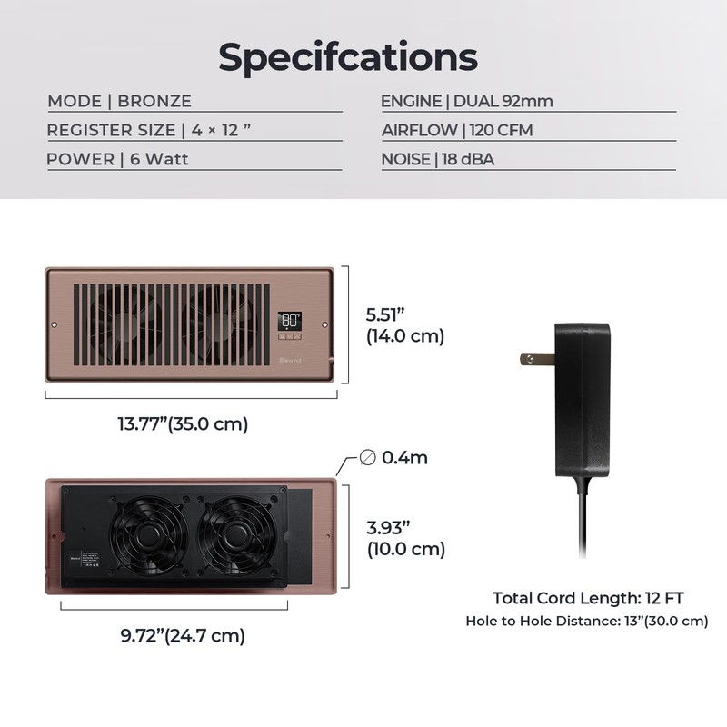 - Compact & Easy to Install: Biowind smart register booster fan is small in size and easy to move or install,making them convenient to use. Fits ONLY 4" x 12" Register Vent| Rated power: 6W | AC Input: 100 to 240 VAC| Airflow: 120 CFM | Noise: 18 Dba | Includes Wall Adapter, plug and play.