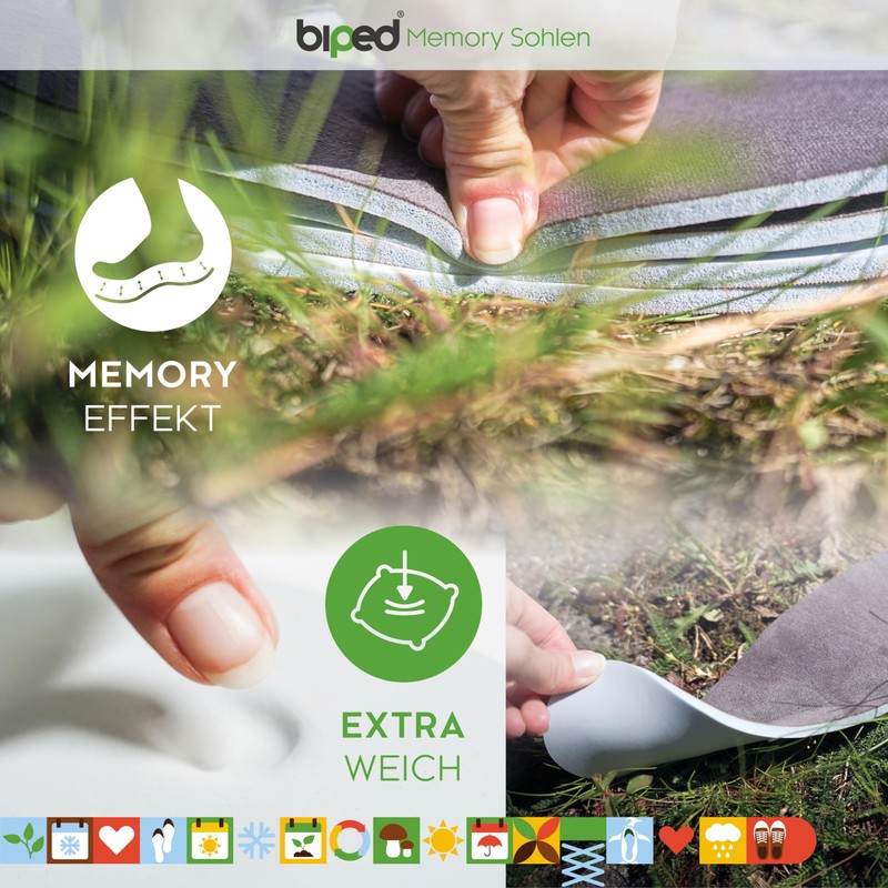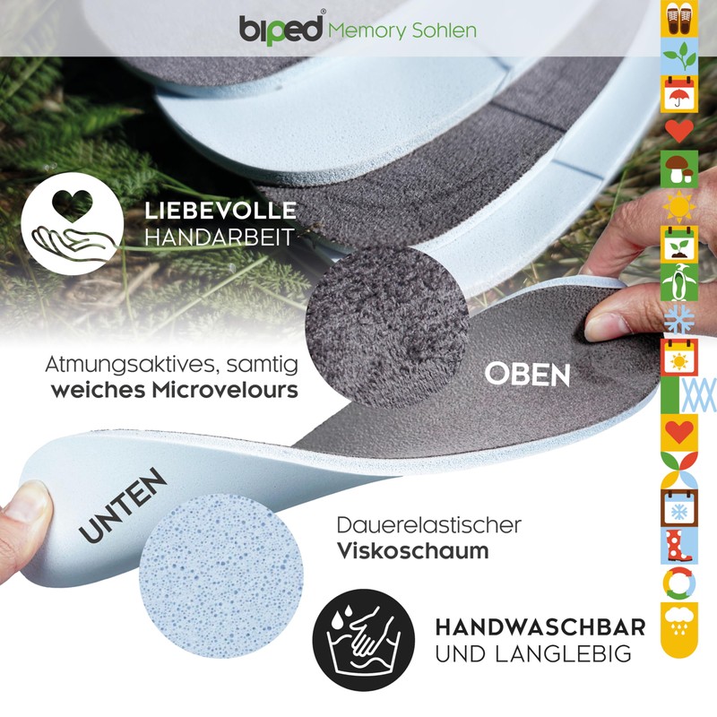 On the top of our biped memory soles, a breathable microfibre fabric is processed. This feels pleasantly soft and keeps your feet dry as it absorbs moisture.