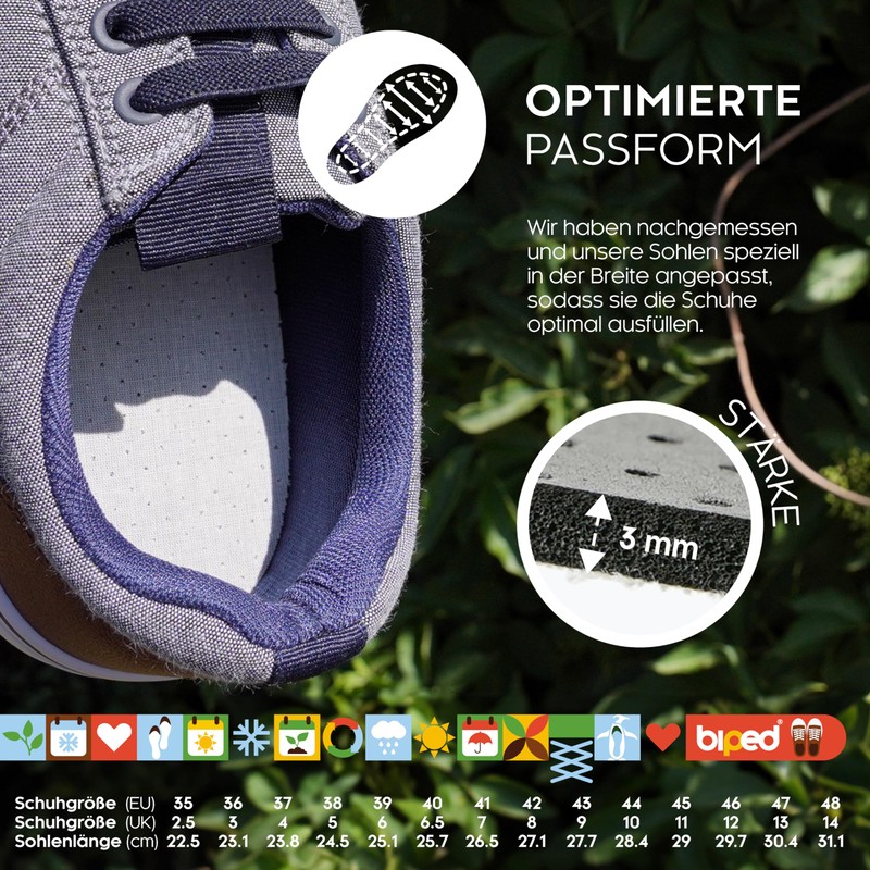 - Easy adjustment: If necessary, you can cut the shoe insoles individually, so they fit in any shoe. With our biped soles, you can enjoy tailored comfort without compromise.