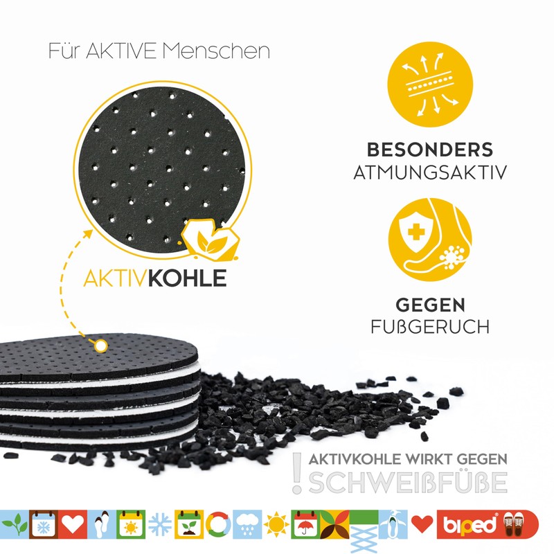 Biped shoe insoles with highly effective activated carbon filter layer keep feet pleasantly dry, provide a fresh feeling and prevent annoying foot odour.