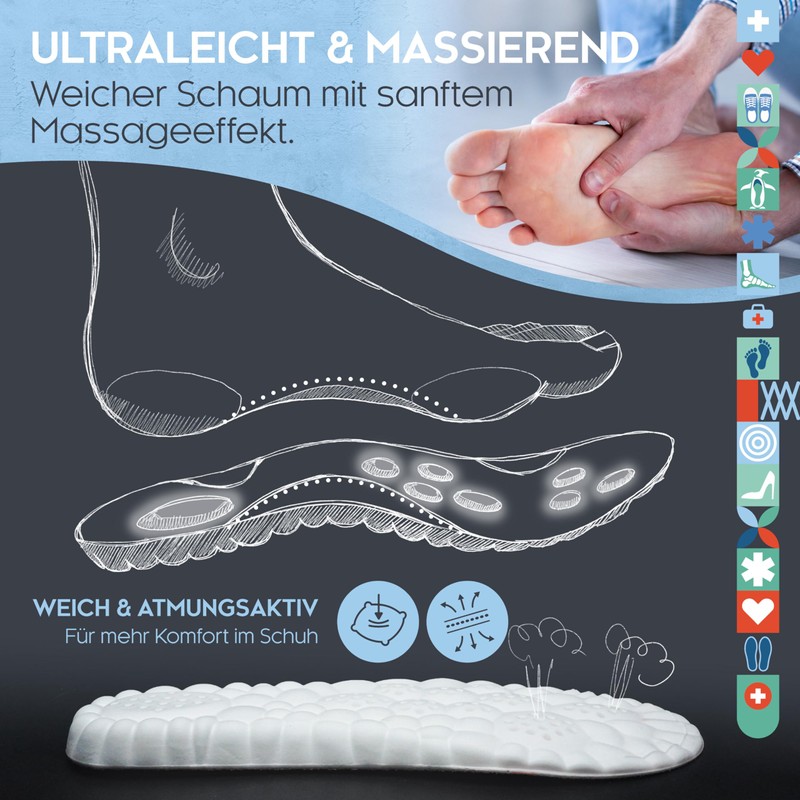 Thanks to the innovative special foam technology, the insoles feel almost weightless. Our Cloud soles gently cushion every appearance, so that the stress on feet and joints is noticeably reduced. Ideal for long standing, walking or active days at work, sports or leisure. Almost as beautiful as a foot reflexology massage and also recommended as heel spur insoles and for plantar fasciitis.