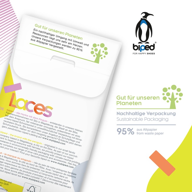 • Good for our planets – biped Laces in many different designs, all in sustainable packaging