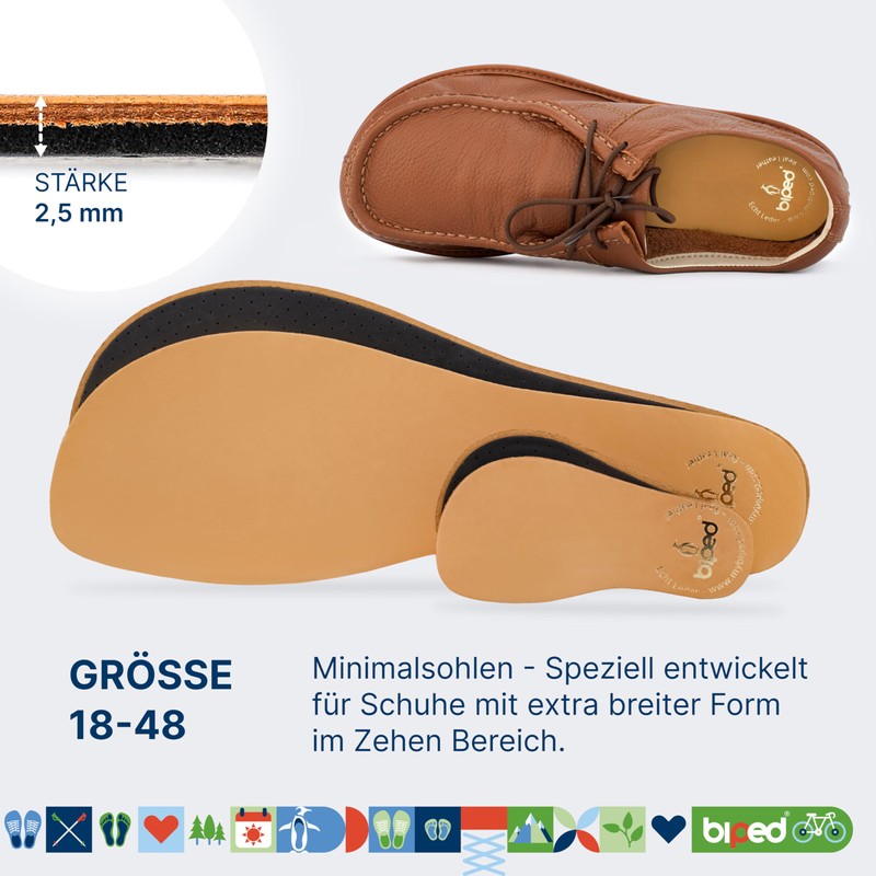 Our minimal soles are high-quality comfort insoles, specially designed for minimal and barefoot shoes. Minimal shoes are characterised by a zero drop (no heel) and extra toe freedom.