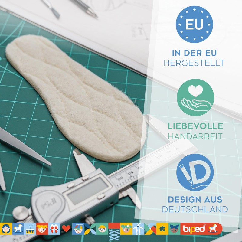 The top of our biped thermal sole is made from 100% real lambswool. Lambswool soles are particularly soft and do not scratch. Your child always enjoys a pleasant climate in the shoes with real lambswool soles. Feet will be pleasantly warm but never too hot. Lambswool balances the temperature and is breathable.