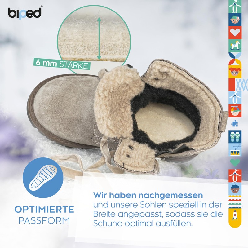 Our biped thermal insoles are breathable, skin-friendly and also ideal for sensitive children’s feet. Biped thermal insoles with real lambswool and aluminium underside keep your child's feet reliably warm.