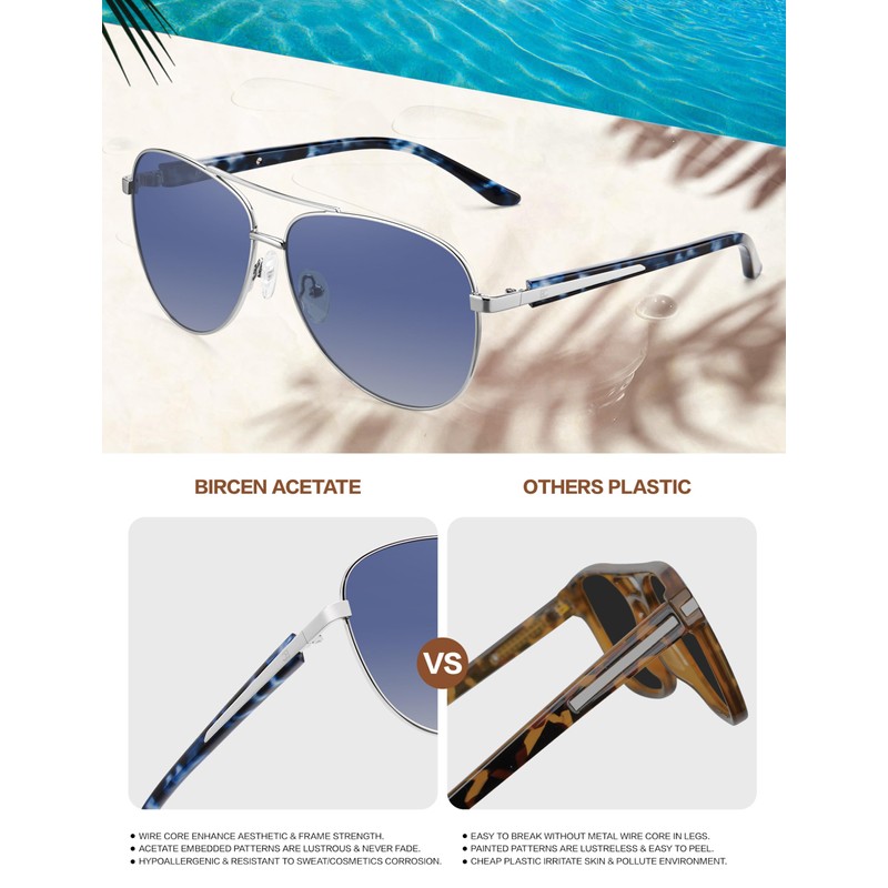 - Acetate Frame: Not ordinary plastic! Bircen women's polarized avaitor sunglasses are crafted with an acetate frame. Acetate is a high-end material, full of shiny and good texture,durable enough for daily wear and tear, easy to manage and hypoallergenic, friendly for individuals with sensitive skin.