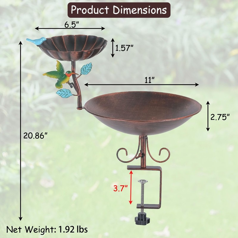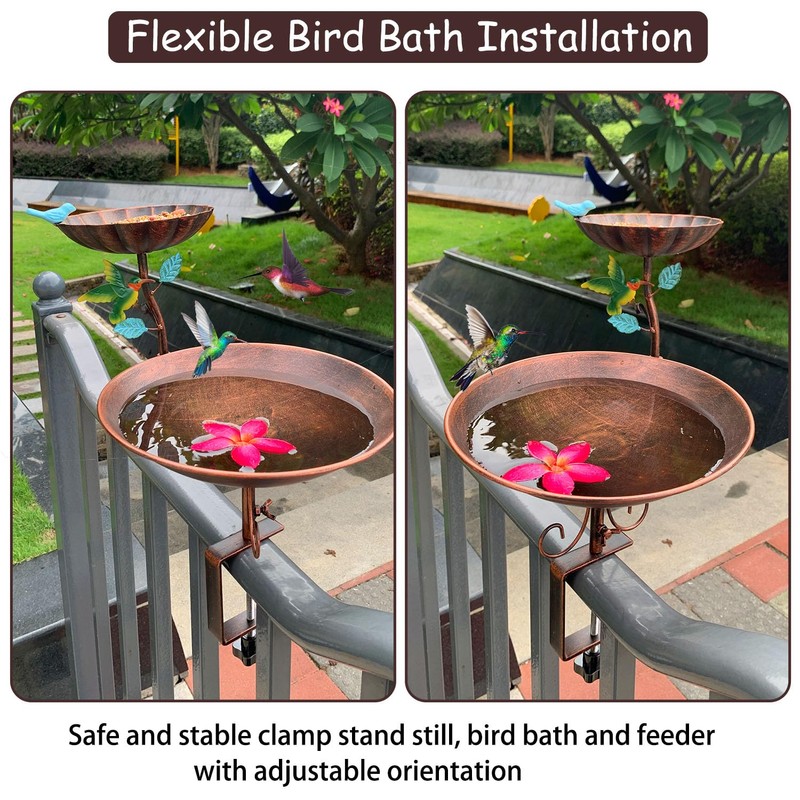 - 【Secure & Adjustable Installation】The adjustable clamp fits railings up to 4 inches wide, ensuring a secure and stable attachment. The rotatable clamp allows you to easily change the position or orientation of the bird bath without removing the clamp—making it simple to refill or clean, and customize the setup to suit your space.