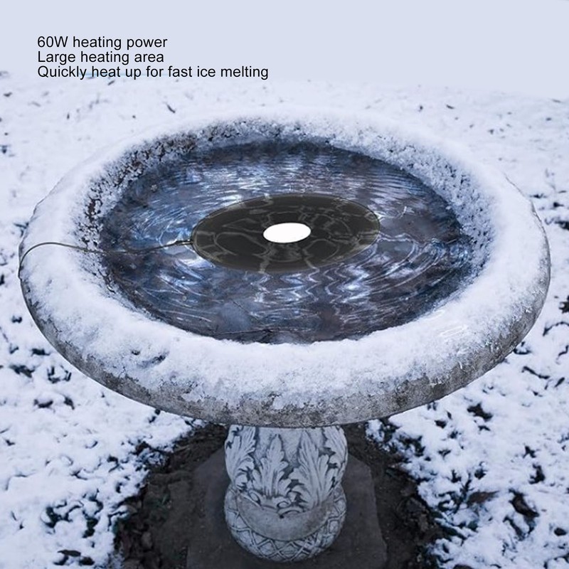 1、Easy Immerse: Bird bath heater can be easily immersed in water without pressing heavy objects, and will not float on the surfaces of the water to affect the ice melting effect. 2、Efficient Heating: Birdbath water heater has 60W heating power, provide large heating area, which can quickly heat up for fast ice melting, suitable for outdoor winter use. 3、Temperature Control: Bird bath deicer built in temperature sensor activates at temperatures below 35°F and stops working when water temperature exceeds 65°F, safety and effective. 4、Safe to Use: PVC wrapped main body is waterproof and heat resistant, bird bath deicer water heater, with pressure sealed edges to prevent short circuits, ensuring safety using. 5、Versatile Use: Bird bath deicer suitable for most outdoor bird baths with no need for extra extension cords, convenient for bird baths, fountains, small fish ponds, farm feeders, etc.