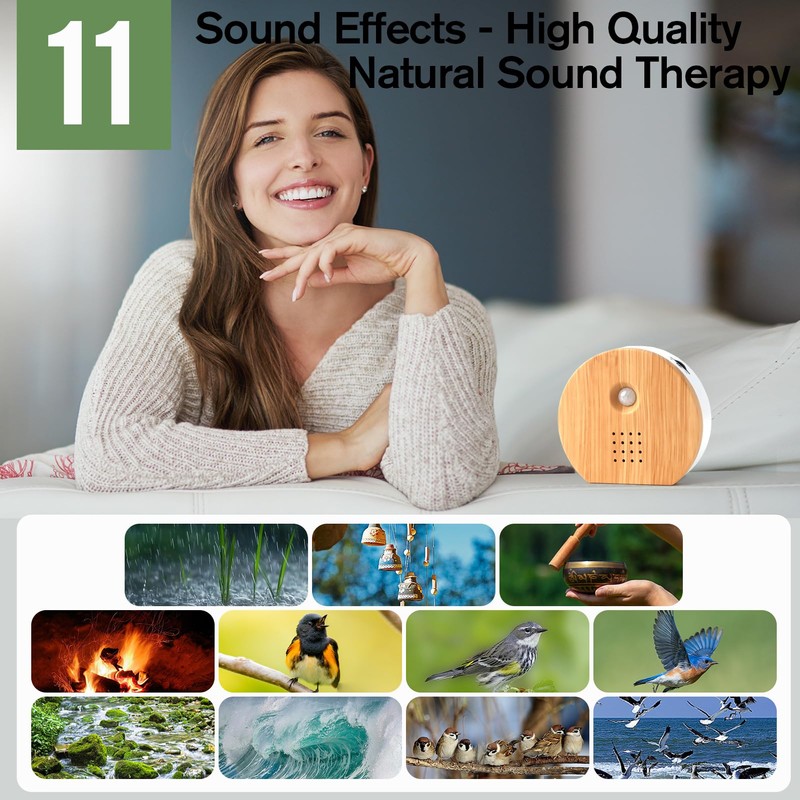 - 11 soothing natural sounds: the nature sounds box contains the chirping of frogs, the singing of natural forest birds, the sound of streams, the sounds of the sea and the screams of seagulls. You can switch between the 11 different sounds according to your personal preferences and thus adjust the sound experience to your mood or environment.