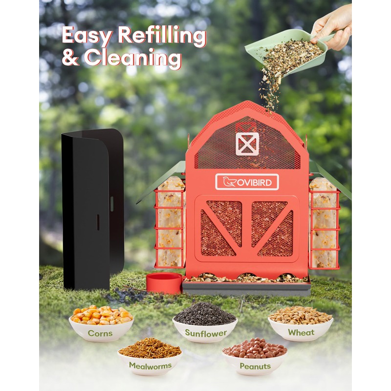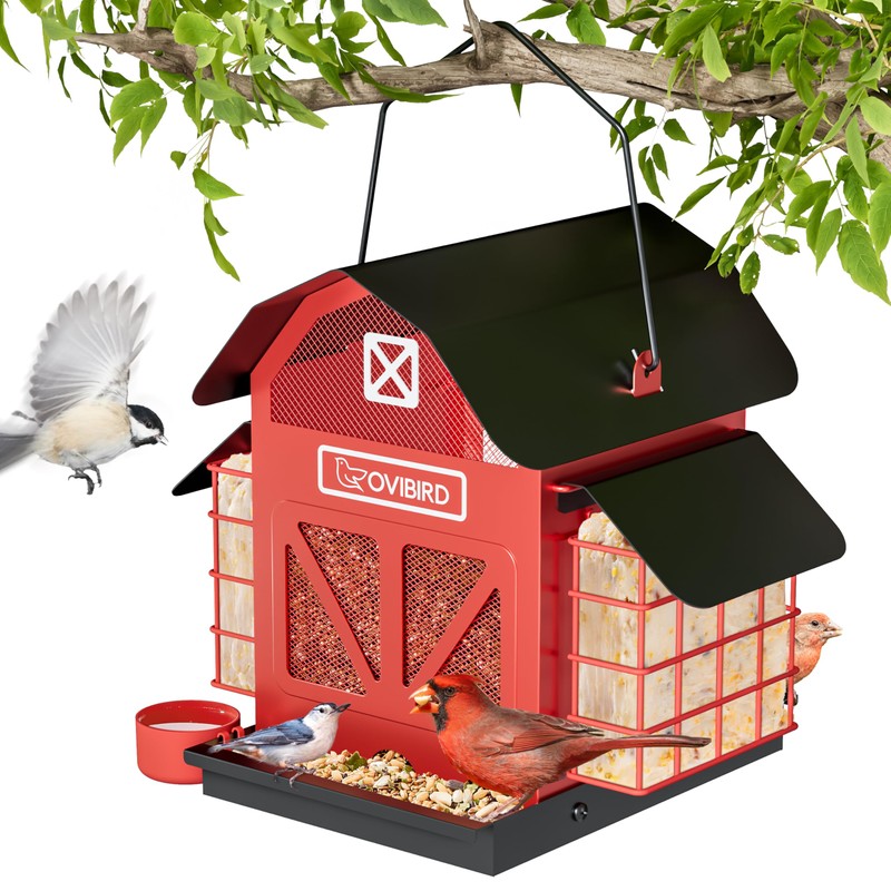 - 【360° Feeding Access & Suet Feeder】With six feeding ports, two suet holders, and a 1.2oz drinking cup, birds can feed from any direction. The open, spacious design and vibrant red color invite multiple birds to enjoy without competition. It's the perfect setup to attract various bird species to your yard.